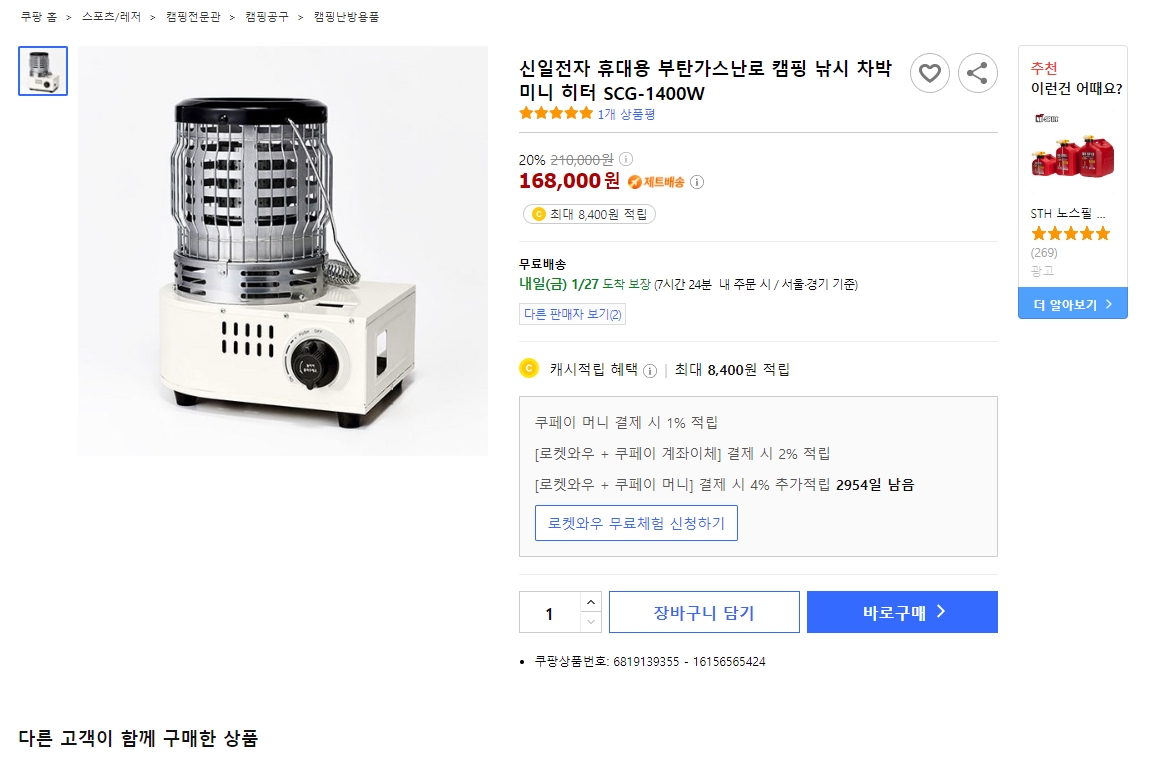 비슷하게 생긴 제품을 찾을 수 있었다. 금액은 배송비 포함 48000원에 배송시간은 5일. 유사한 국산 가스 난로들과 비교하면 반에 반값이니 내 입장에선 혹 할 수밖에 없었다. 다만 필자는 캠핑 용품을 구매할 때 스스로 지키려 하는 법칙이 있다. 특히 오늘과 같이 연료를 사용하는 제품과 배터리를 사용하는 제품군은 안전상 문제로 인증이 제대로 되지 않은 중국산 제품은 구매하지 않는 것이다. 이러한 제품군들은 캠퍼의 시선이 부재시라도 스스로 작동을 해야 하는 경우가 다반사인데 자칫 잘못하면 화재로 이어질 수 있기 때문이다. 하지만 유부남이란 현실과 돈 앞에 장사가 있겠는가... 일단 질렀다. 적어도 쓰다가 죽진 않겠지 라는 생각에 말이다.