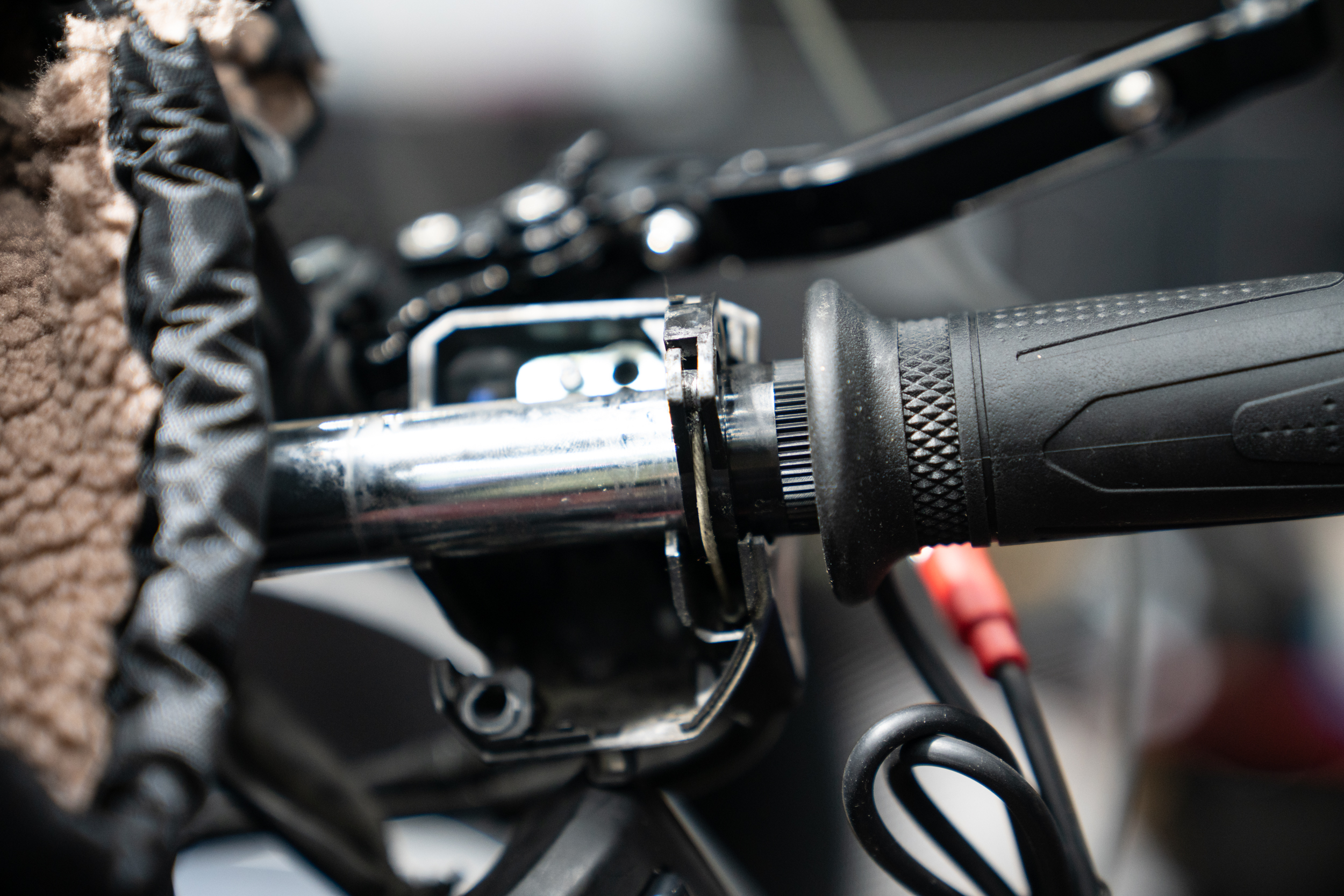 미케닉과 소비자들이 가장 어렵게 생각했던 악셀 그립쪽에 대한 열선 장착이 끝났다. 악셀링에 따른 전원 공급선 유격만 확인 후 소량의 접착제를 케이블 어댑터 톱니에 발라 밀어 넣어주기만 하면 된다. 이후 기존에 사용하고 있던 순정 핸들 밸런스도 아무 와셔 1~2장만을 추가해 사진과 같이 그립간 유격을 주어 악셀링의 부드러움을 더했다. 속지를 가공해 낑겨 넣는 압박식 방식은 아무리 피팅을 잘 해도 고질적인 악셀 빡빡함이 있는데 그러한 이질감이 싫다면 탈리스만으로 갈아타시라.
