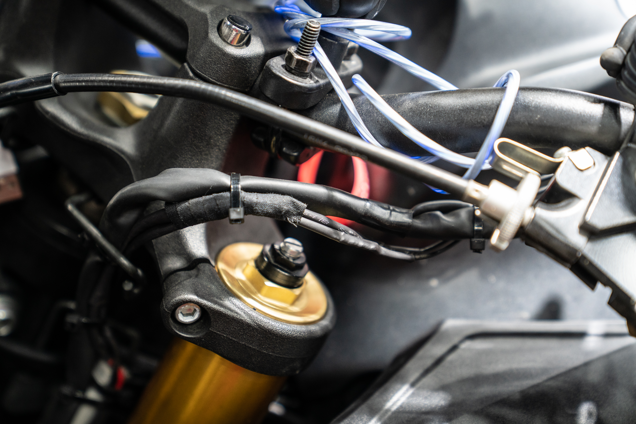 이건 스즈키 GSX S1000F 핸들 조작부 왼쪽에 스위치를 달고 정리한 모습이다. 기존의 순정 브레이크 선과 함께 묶어 이질감이 최소한으로 될 수 있도록 하였다. 매인 하네스와 스위치 배선은 눈으로 직접 확인이 가능한 곳에 위치한 만큼 혹시라도 문제가 생길 경우 어렵지 않게 유지보수가 가능하도록 하였다.
