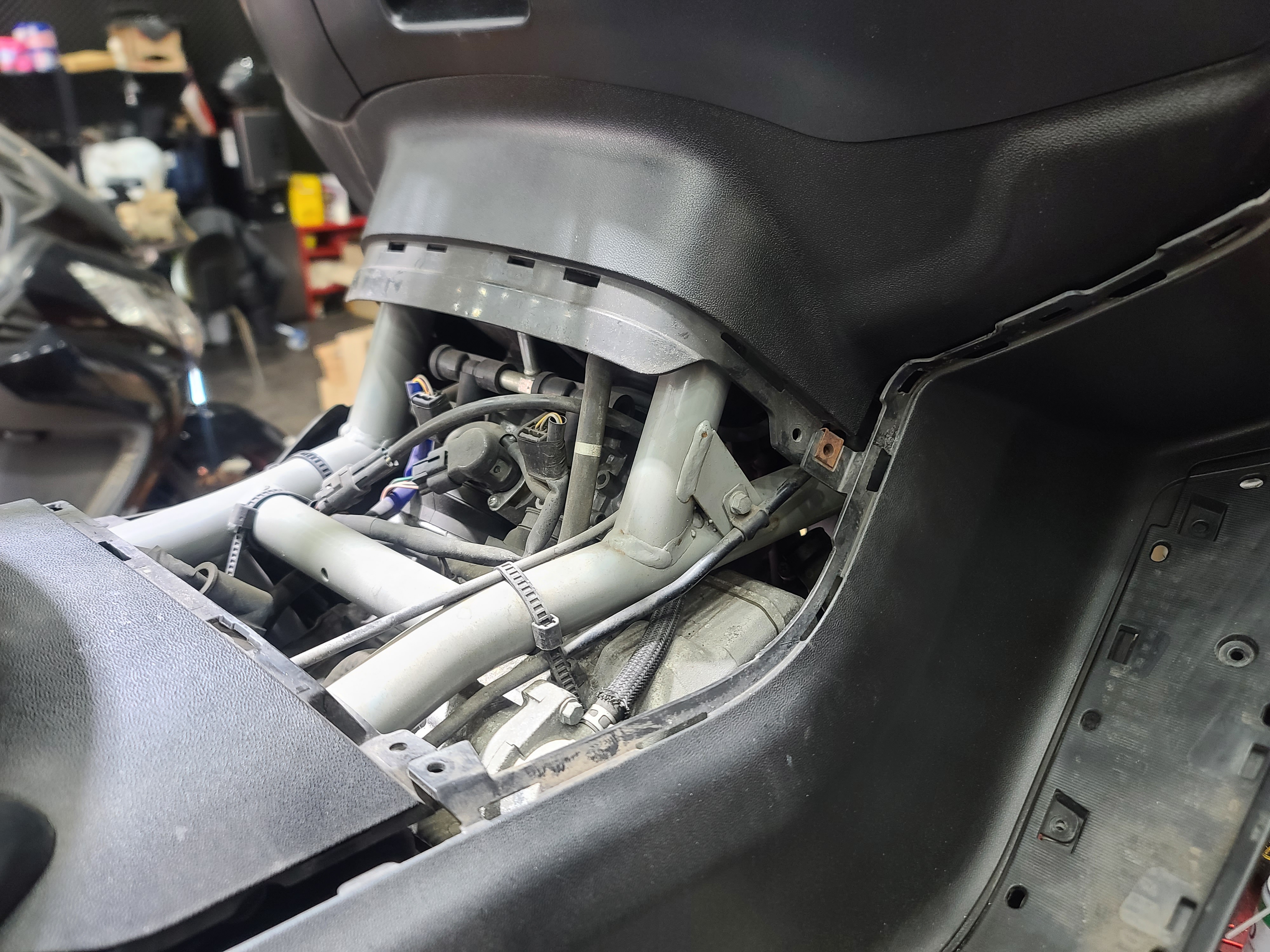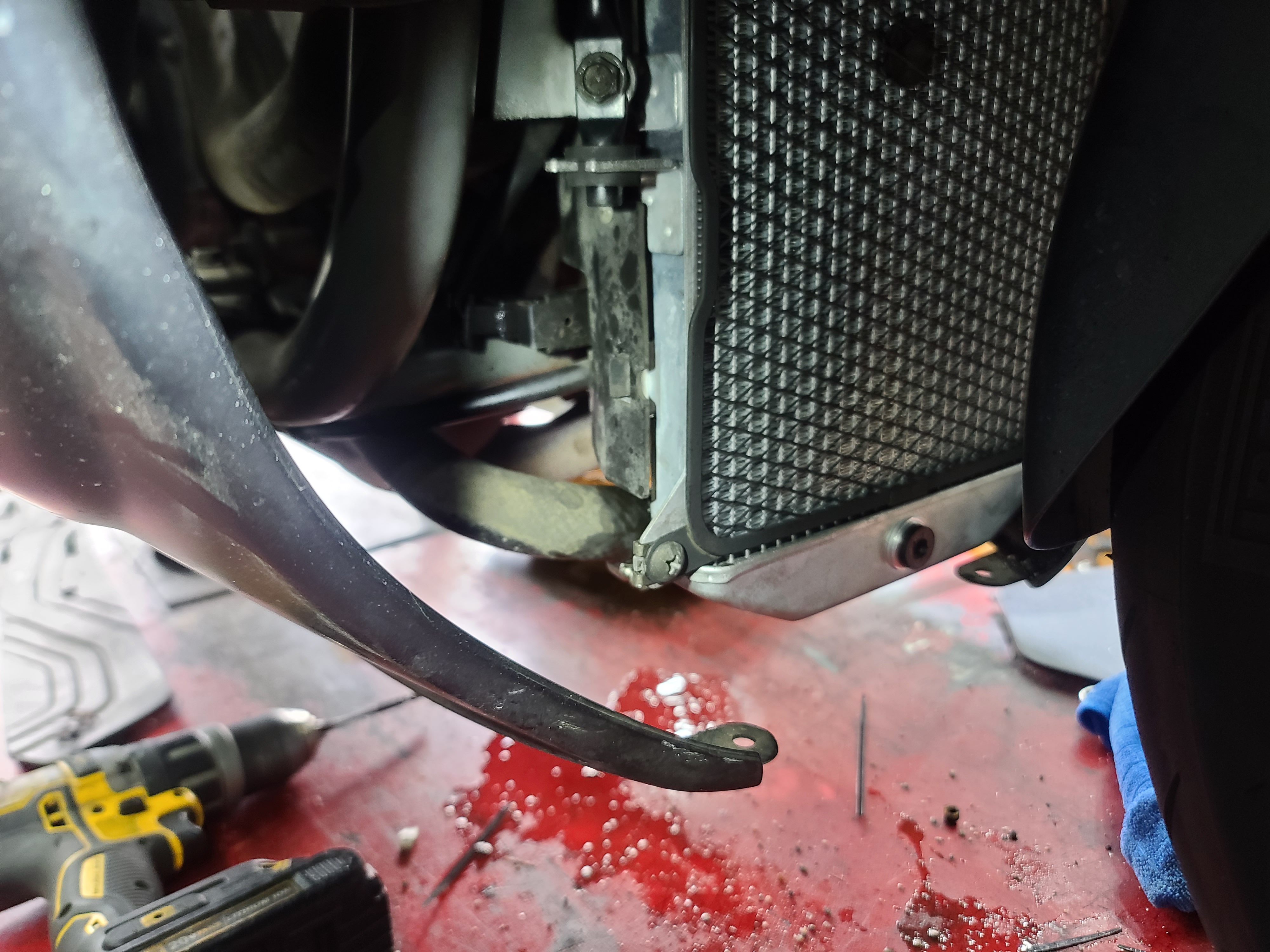 원칙적으로 라디에이터를 정확하게 탈거하기 위해선 프런트와 측면 카울을 들어내야만 한다. 라디에이터 자체가 문제가 아니라 이것과 체결된 호스를 빼내야 하는데 이놈의 것이 밖을 보고 있는 것이 아니라 카울 깊숙한 안쪽으로 자리를 잡고 있기 때문이다. 특히 이중에 SUS 반도를 체결하는 십자 나사가 엔진 헤드쪽을 바라보고 있다. 결국 뜯지 않으면 공구를 삽입할 방법이 없는 것이고 이에 위 사진과 같이 측면 일부만 열어 작업을 진행하게 되었다. 필자야 귀찮아서 이렇게 한 것이니 참고만 하도록 하자.