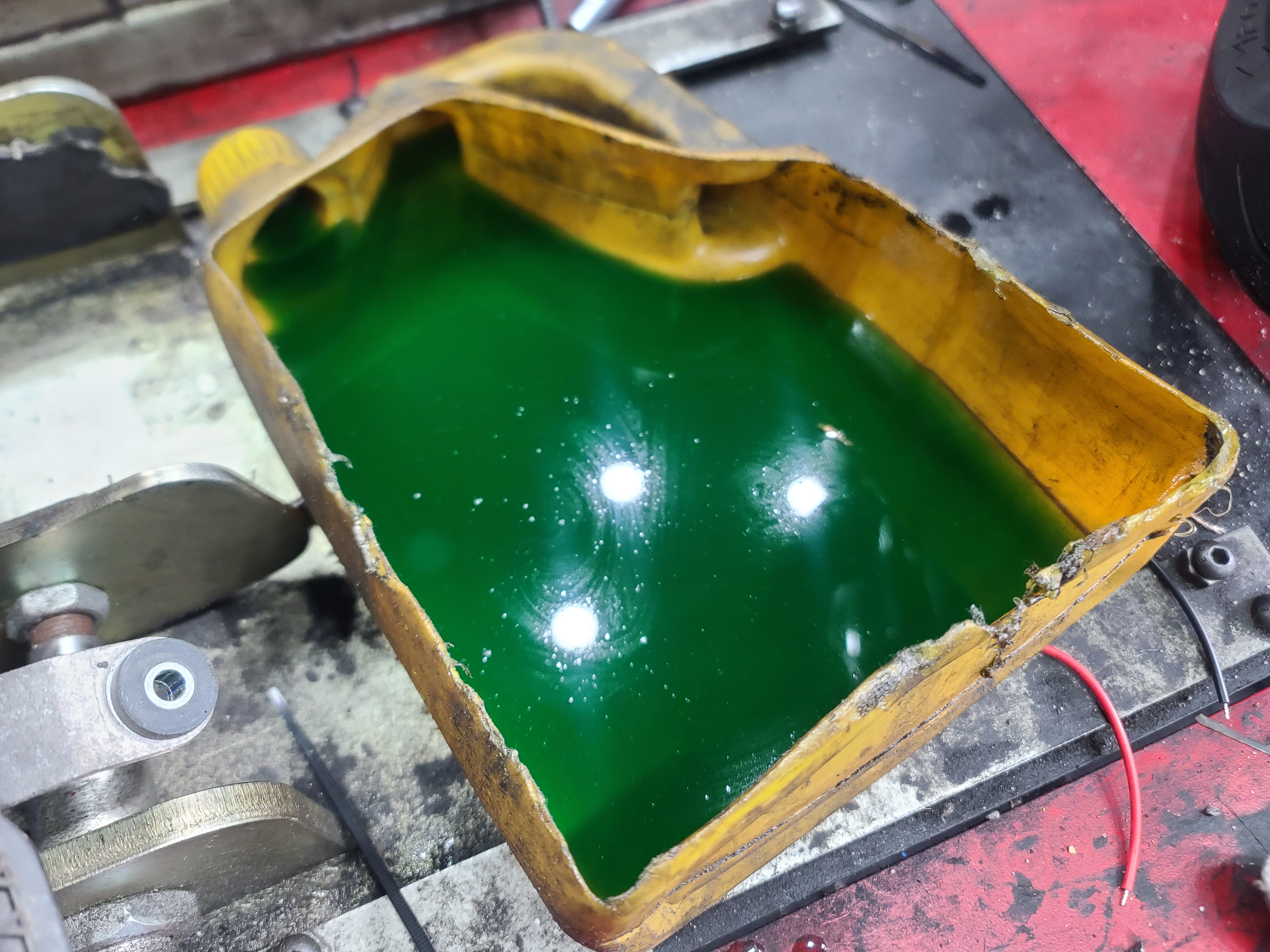 라디에이터를 탈거하면서 미리 적출해 놓은 냉각수이다. 냉각수는 빼낼 때 양을 체크하는 경우도 있으나 그러한 부분은 큰 의미가 없고 냉각수 본연의 색이 맞는지 확인하는 것이 가장 중요하다. 순환계 부식이 심하거나 엔진 블럭 사이의 동판 가스킷이 파손되어 있는 경우는 약간의 갈빛을 띄는 경우가 있고 이럴땐 작업 방식이 완전히 달라질 수 있기 때문이다. 아무튼 다행히 필자의 버그만650은 매우 깨끗한 녹빛을 보여주었다.
