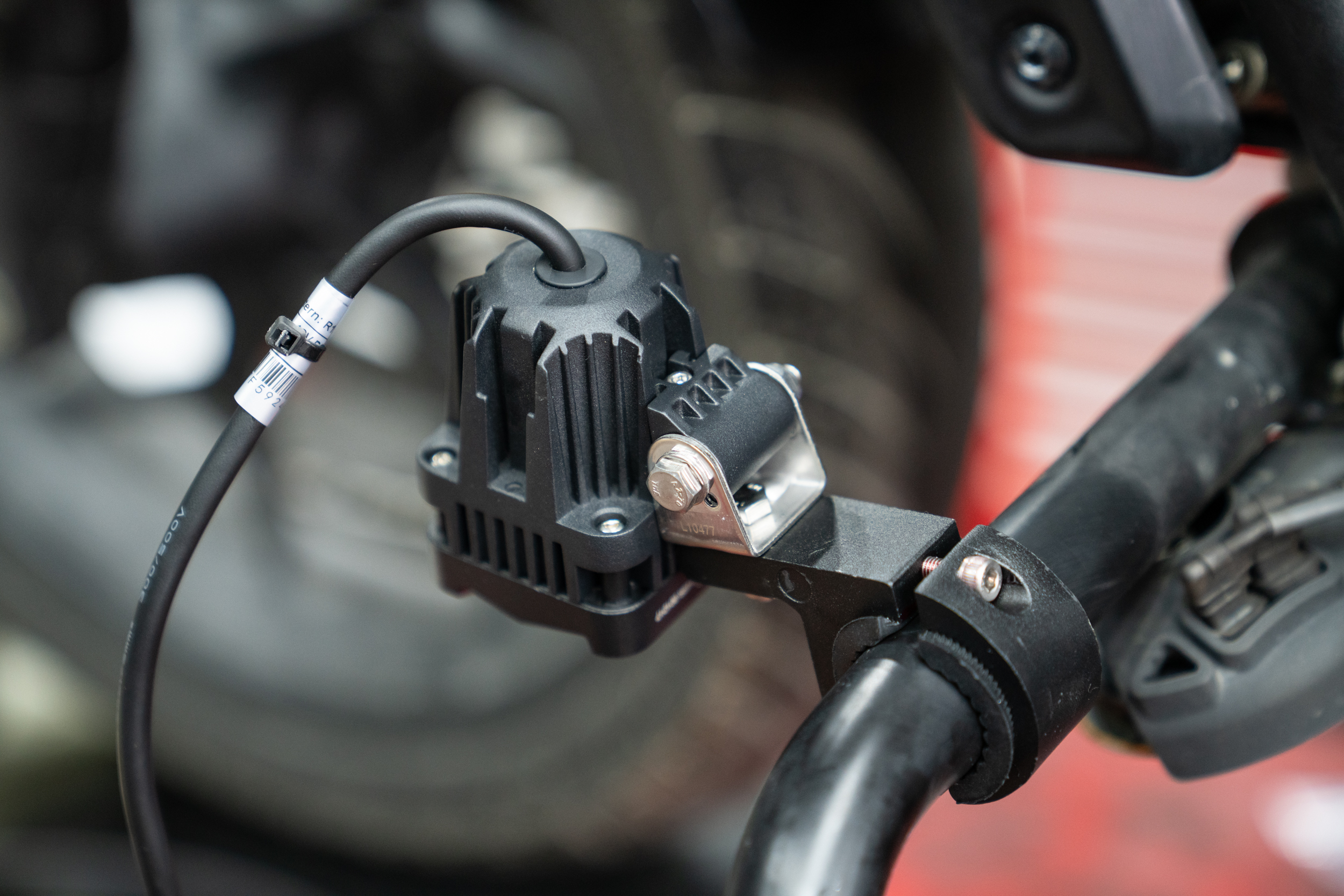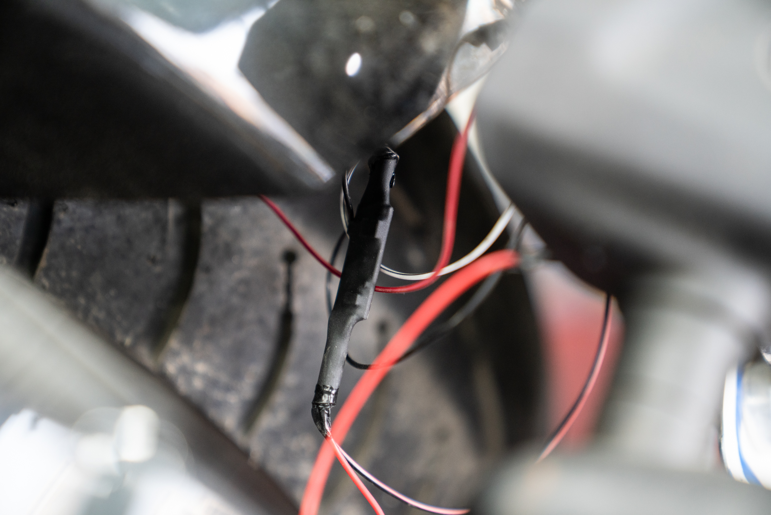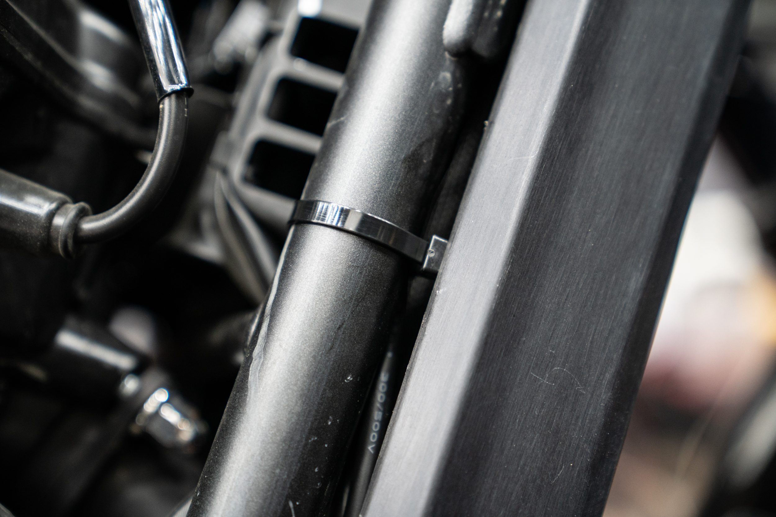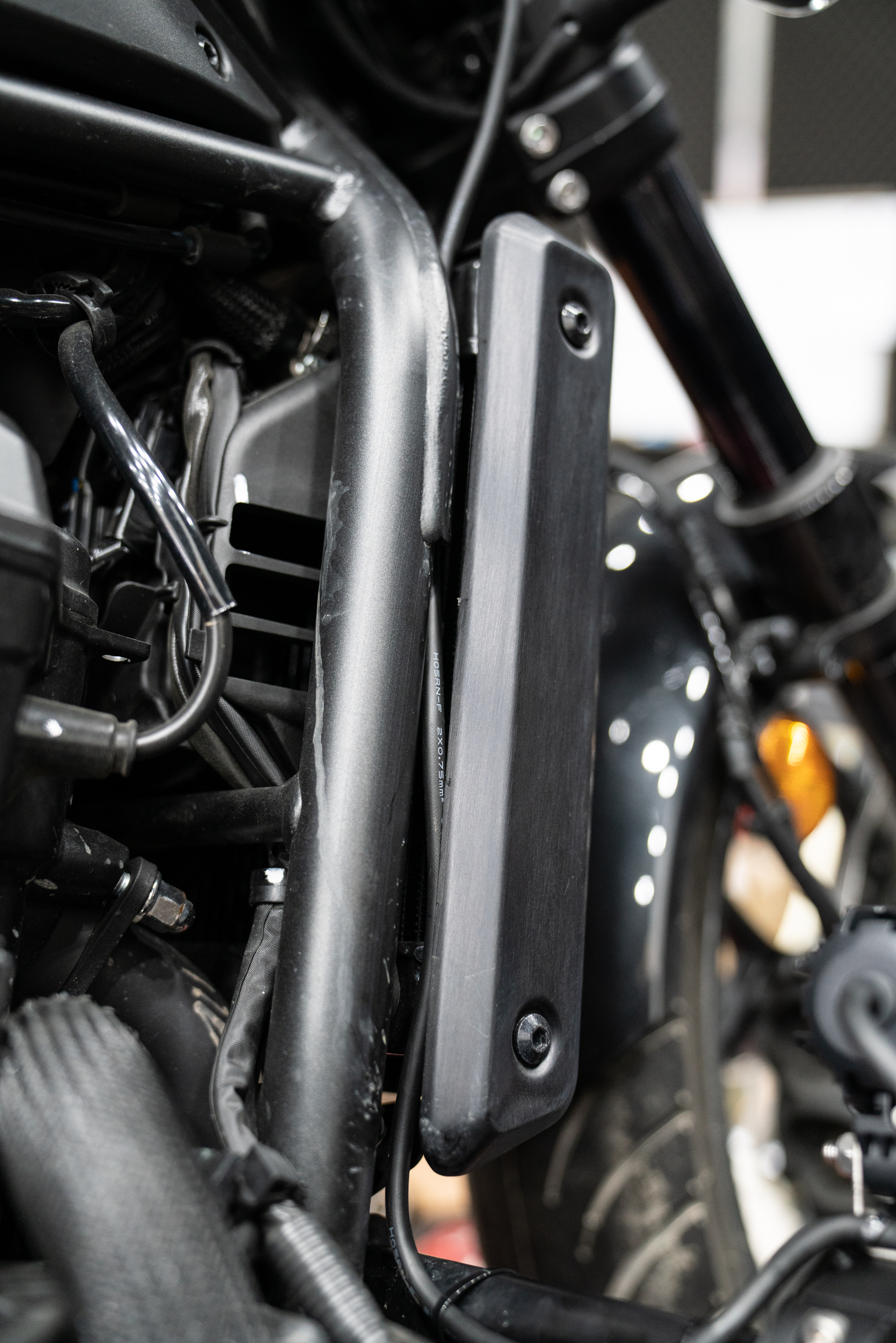 이렇게 설치된 제품의 매인 배선은 차량의 측면 프레임들을 이용해 스위치가 있는 핸들 상부로 올려지게 된다. 크루저 장르에선 주로 라디에이터 측면의 프레임을 이용해 고정된다. 자칫 뜨거운 부위로 배선이 녹을까 하는 우려의 목소리도 있겠으나 이미 본 제품의 배선은 300도 까지 버티는 VHD 특수 배선을 사용하고 있기에 전혀 무방하겠다. 그래도 주의해야 할점은 안쪽면에서 강한 팬이 작동하고 있는 만큼 혹시라도 풀림이 생긴다 한들 이와 간섭이 없도록 해줘야 한다. 느슨함에 따른 간섭이 생기면 고가의 라디에이터가 망가질 수 있는 만큼 이 부분에 대한 유격은 최소한으로 하고 케이블 타이도 가장 두꺼운 것으로 사용한다.