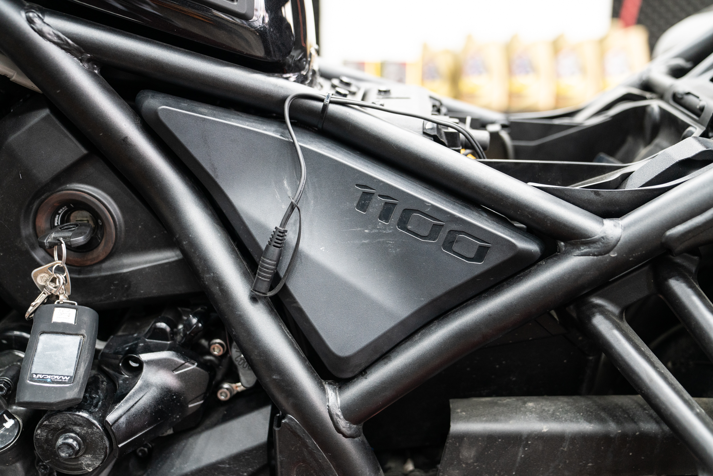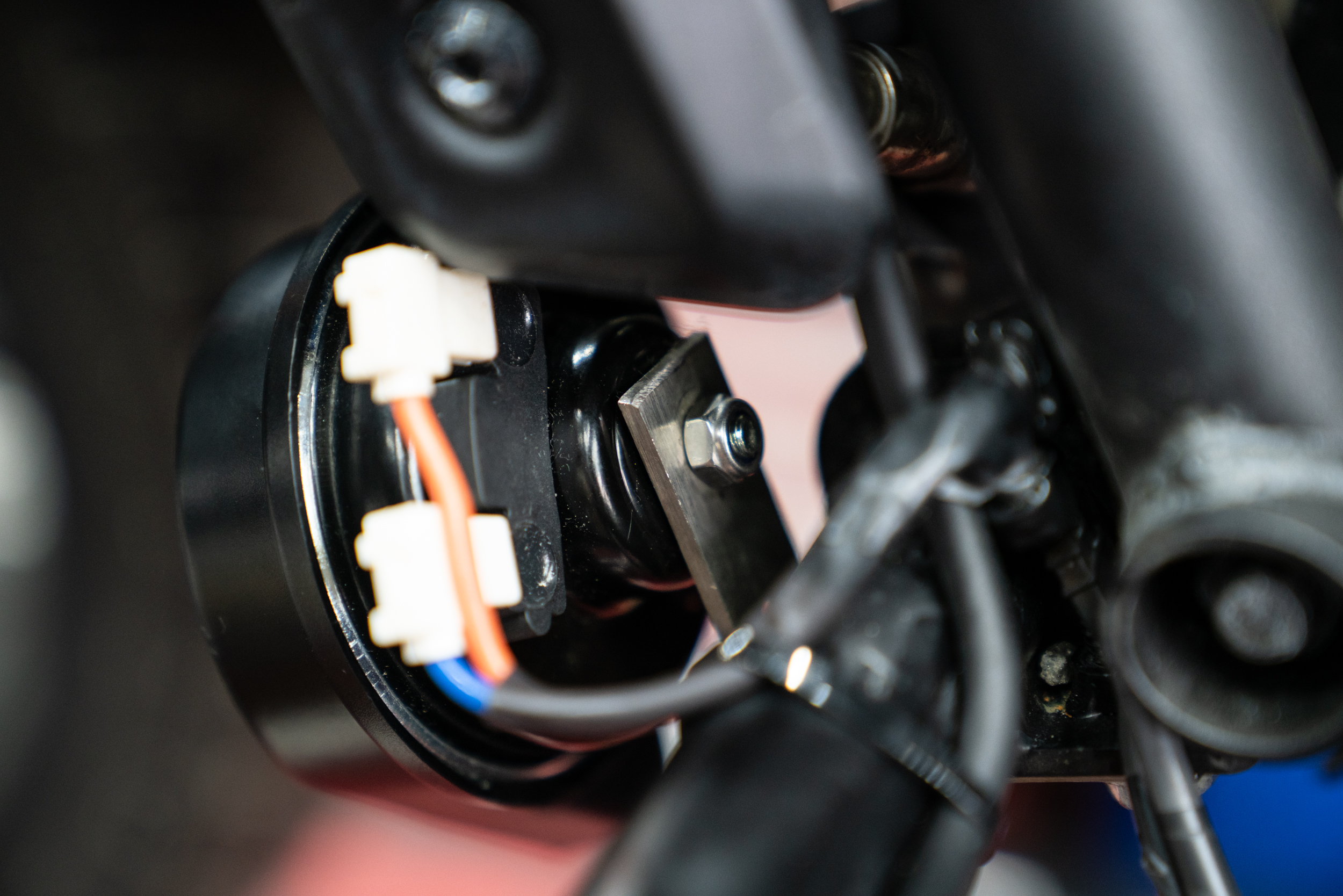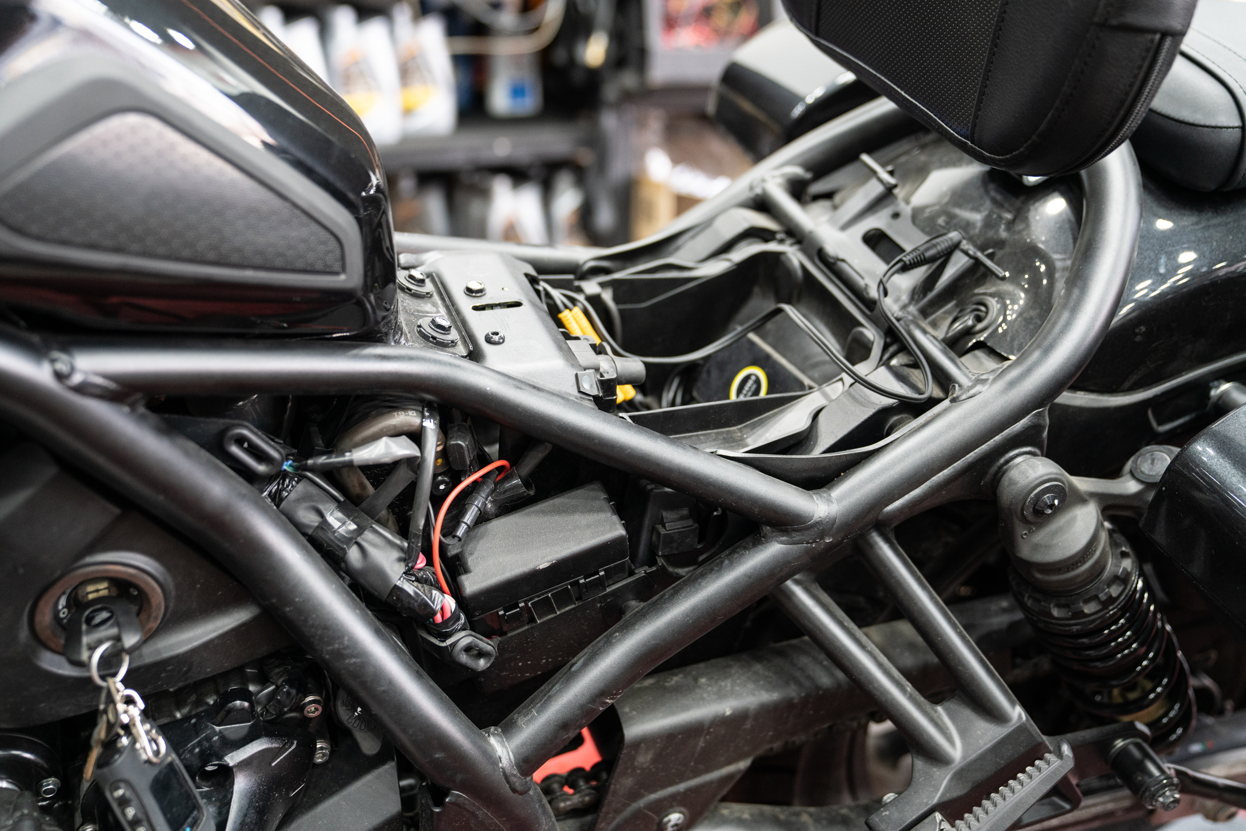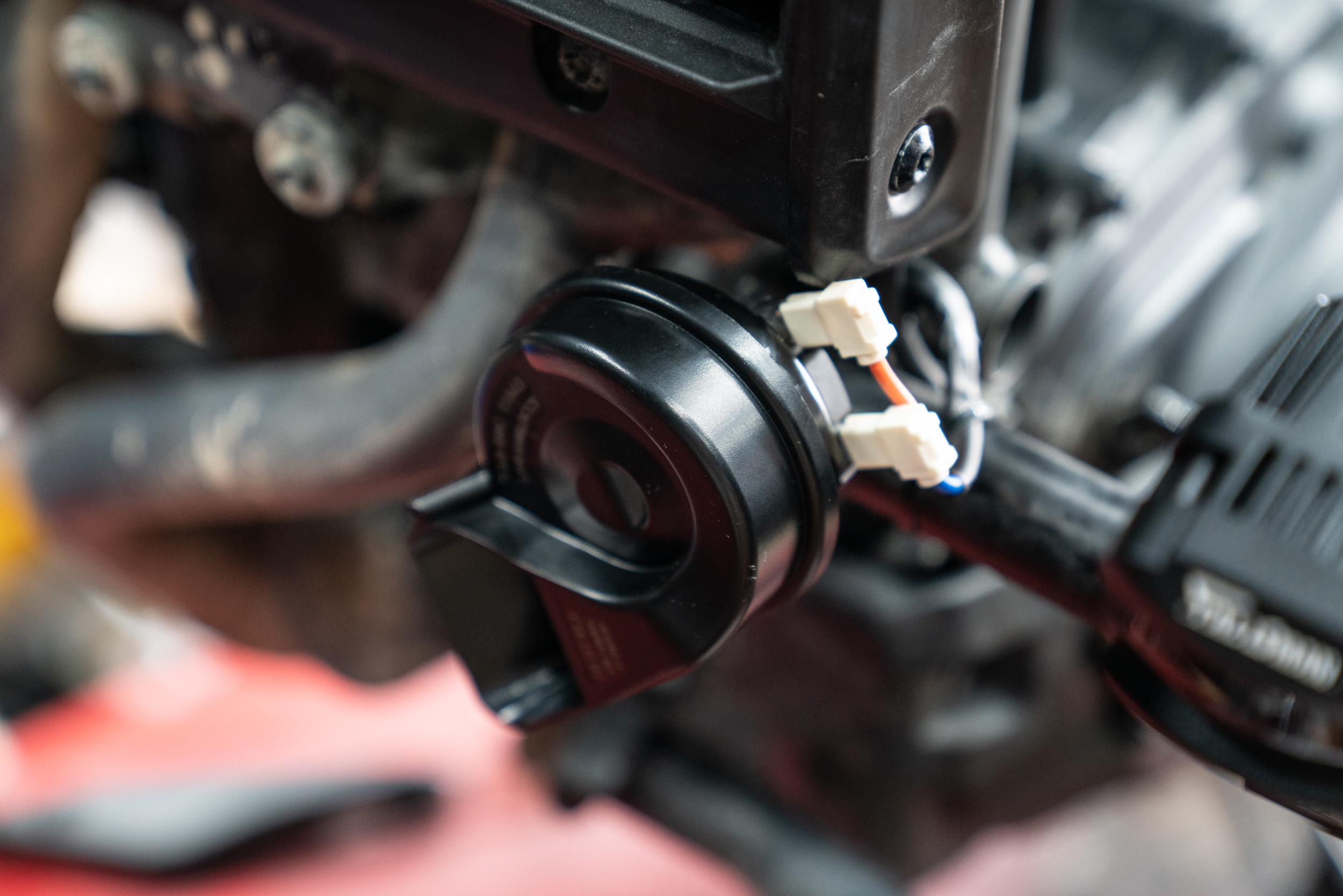 이렇게 설치된 제품의 매인 배선은 차량의 측면 프레임들을 이용해 스위치가 있는 핸들 상부로 올려지게 된다. 크루저 장르에선 주로 라디에이터 측면의 프레임을 이용해 고정된다. 자칫 뜨거운 부위로 배선이 녹을까 하는 우려의 목소리도 있겠으나 이미 본 제품의 배선은 300도 까지 버티는 VHD 특수 배선을 사용하고 있기에 전혀 무방하겠다. 그래도 주의해야 할점은 안쪽면에서 강한 팬이 작동하고 있는 만큼 혹시라도 풀림이 생긴다 한들 이와 간섭이 없도록 해줘야 한다. 느슨함에 따른 간섭이 생기면 고가의 라디에이터가 망가질 수 있는 만큼 이 부분에 대한 유격은 최소한으로 하고 케이블 타이도 가장 두꺼운 것으로 사용한다.