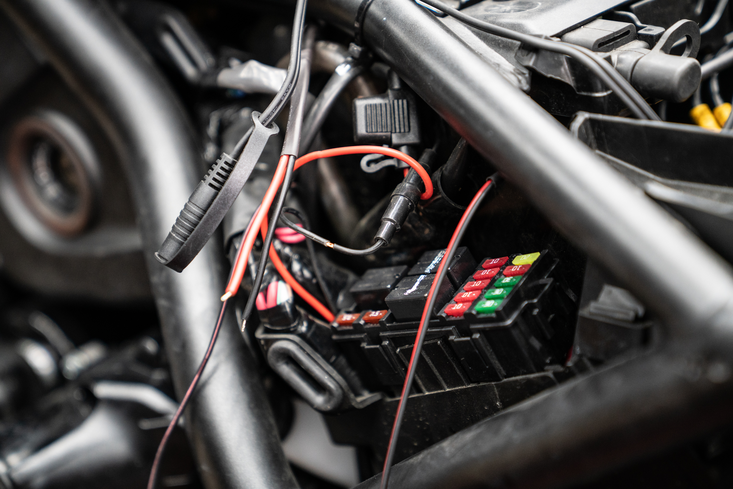 이제 이렇게 장착된 등화장치의 배선들은 하나로 묶어 전원선과 연결한다. 측면 카울을 열면 사진과 같은 퓨즈함이 나오는데 이중엔 제조사에서 만들어 놓은 잉여 전력선이 따로 있는 만큼 이를 이용해 각 종 기기들을 운용하면 된다. 다만 서비스 전력선엔 열선 조끼 배선과 블랙박스 및 충전 거치대까지 연결해 운용되고 있던 만큼 용량값 확인은 필수이며 이상이 없을때만 이를 사용하고 가용 전력이 넘어갈 소지가 있는 경우는 단자를 분배해 줘야 한다.