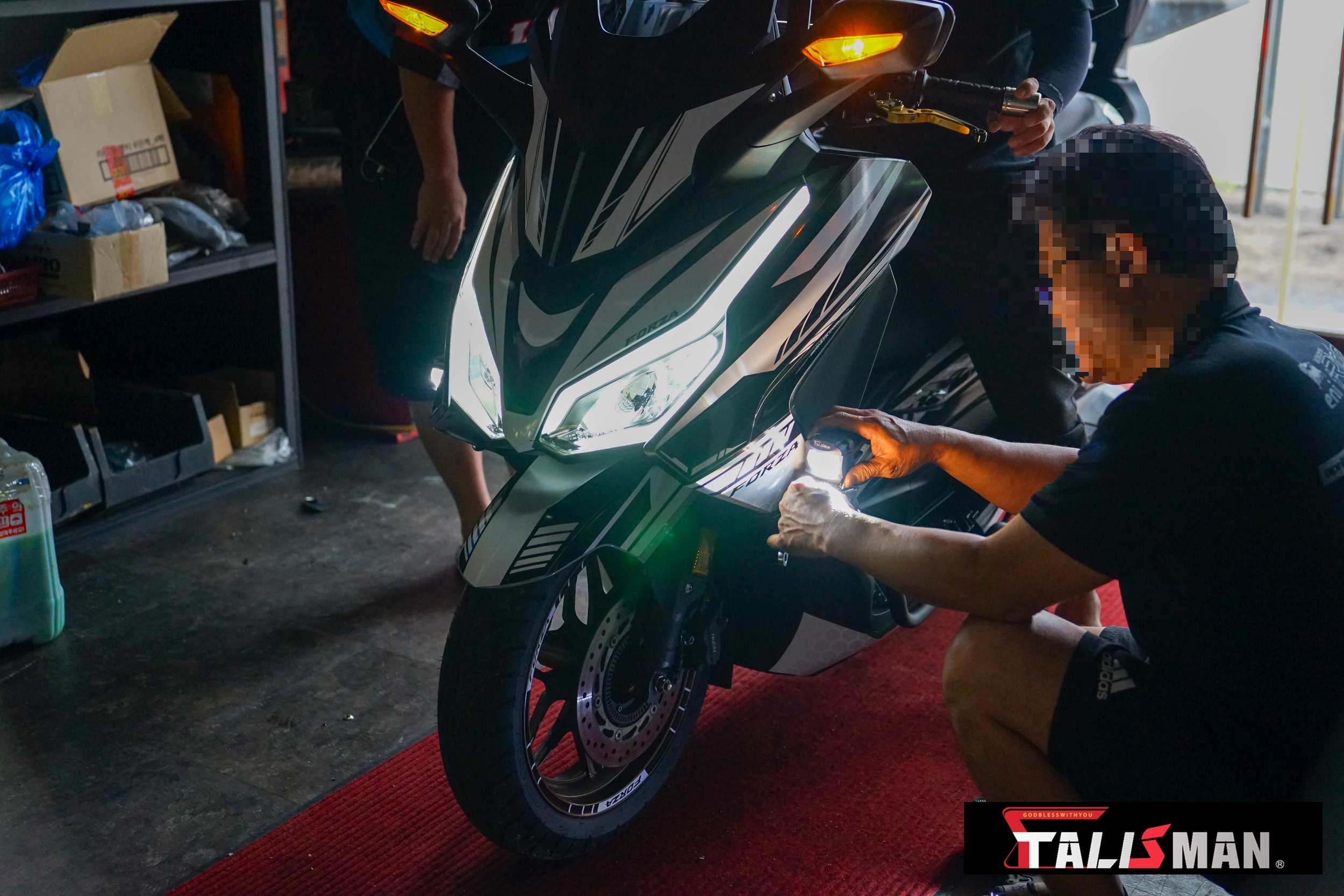 장착 후 안개등의 전원 공급선은 측면 카울을 타고 핸들 상부를 경유하게 된다. 이러한 마감 방식은 작업자 입장에선 최선의 방법이라 생각되긴 하나 라이더의 성향에 따라 배선 마감이 미흡해 보일 순 있을 것이다. 다만 해당 상황에서 조금 더 깔끔하게 시공을 하려 한다면 프런트 카울을 모두 내린 후 탈리스만의 굵은 배선이 카울 틈으로 밀어 넣어야 하는데 이 경우 단선 방지를 목적으로 부득이하게 카울을 가공해야 하고 이로인한 작업 시간이나 공임이 배로 나올 수 있다는 것이다. 아울러 모든 튜닝 장치는 소모품으로 여겨지는 만큼 보증기간이 있다 해도 하자가 생기면 되려 너~~~무 꼼꼼한 시공은 역으로 독이 될 수 있다는 것을 명심하자. 아무튼 모든 전기 장치는 추후 유지보수를 고려한다면 어느정도 일정 부분에 대해선 풀어 놓는 편이 좋다.